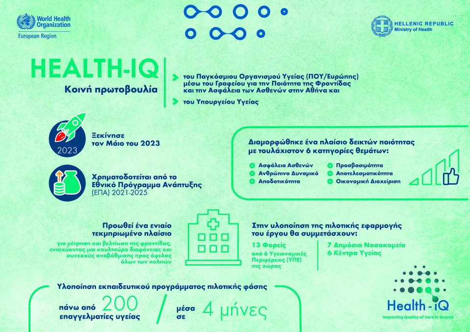 Το πρόγραμμα HEALTH-IQ ξεκίνησε τον Μάιο του 2023 και αποτελεί κοινή πρωτοβουλία του ΠΟΥ/Ευρώπης και του Υπουργείου Υγείας. Χρηματοδοτείται από το Εθνικό Πρόγραμμα Ανάπτυξης (ΕΠΑ) 2021-2025 και προωθεί ένα ενιαίο, τεκμηριωμένο πλαίσιο μέτρησης και βελτίωσης της φροντίδας, ενισχύοντας μια κουλτούρα διαφάνειας, λογοδοσίας και συνεχούς αναβάθμισης προς όφελος των πολιτών.
